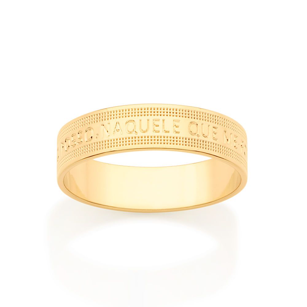 ALIANÇA TRABALHADA NA LATERAL, COM ESCRITA "TUDO POSSO NAQUELE QUE ME FORTALECE" AO CENTRO. MED 5MM. COLEÇÃO RE_ENCONTRO - CATÁLOGO ANUAL 2022