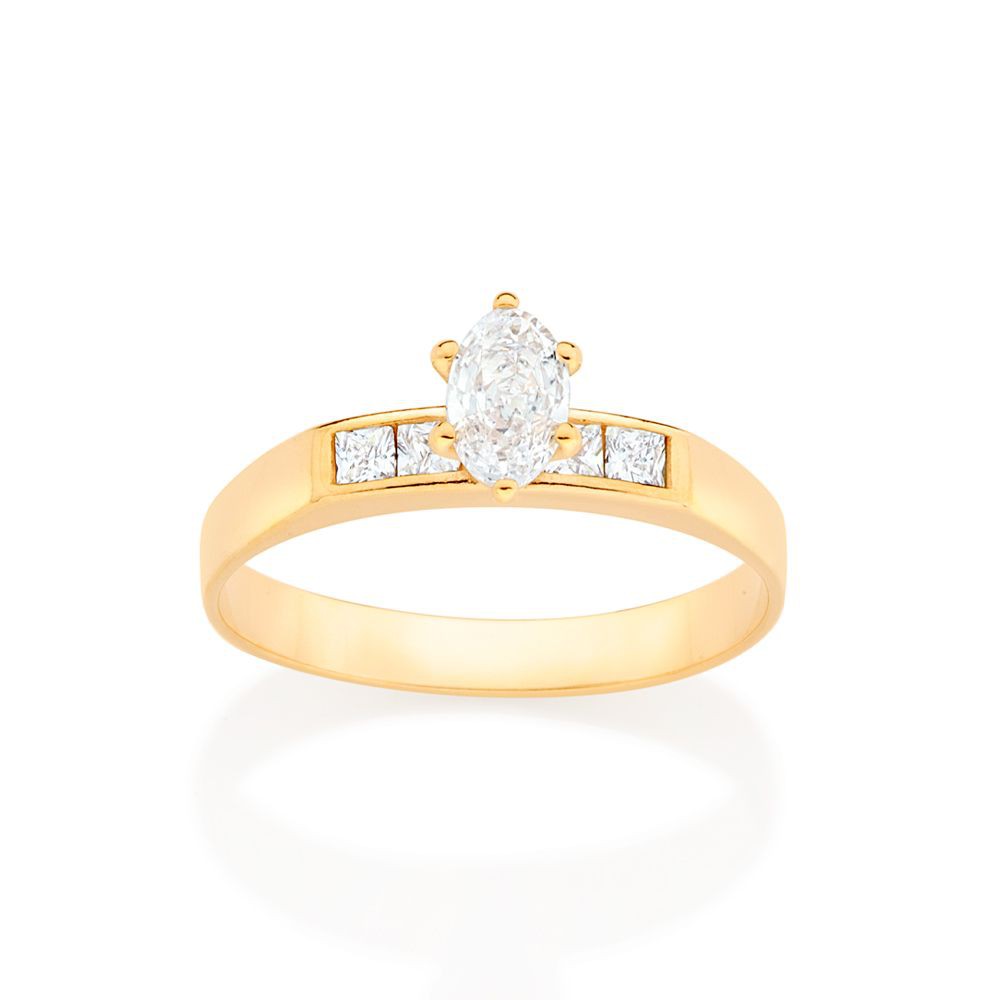 ANEL SOLITÁRIO CRAVEJADO POR 4 ZIRCÔNIAS CARRÊS DE 2X2MM E 1 ZIRCÔNIA OVAL DE 4X6MM AO CENTRO. COLEÇÃO MOMENTOS PARA CELEBRAR 2022