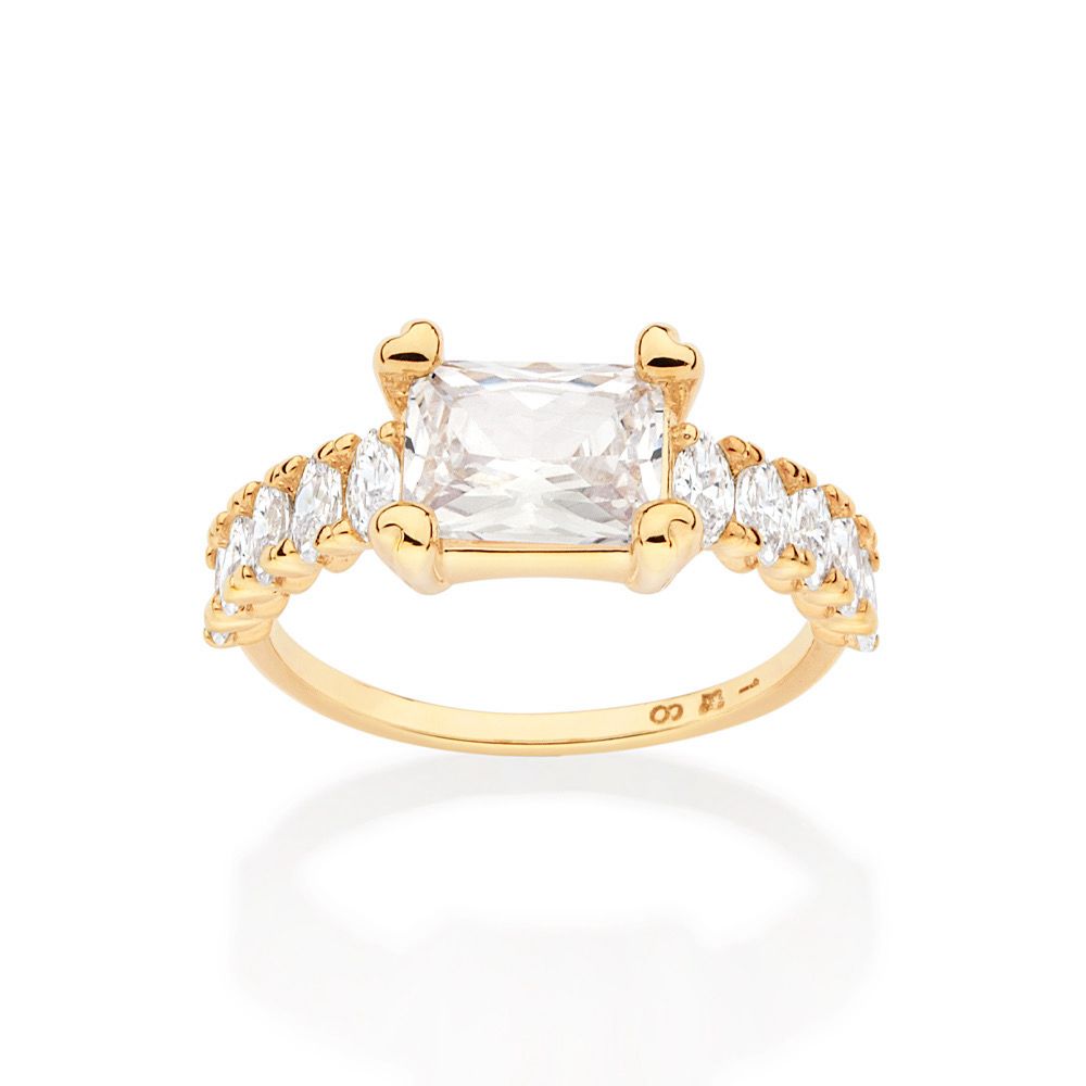 ANEL SOLITÁRIO COMPOSTO POR 10 ZIRCÔNIAS NAVETE DE 2,00MM X 4,00MM E 1 ZIRCÔNIA BAGUETE DE 6X8MM. COLEÇÃO FESTEJAR 2023