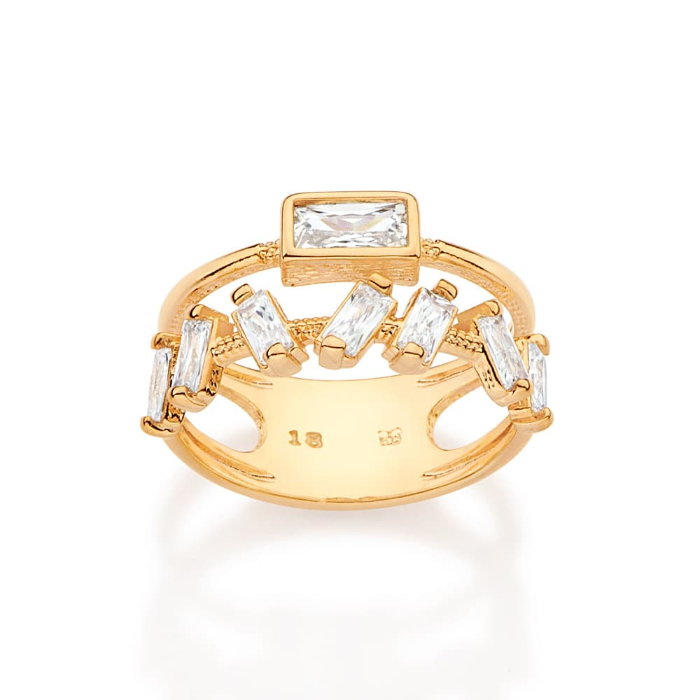ANEL ARO DUPLO COM 1 ZIRCÔNIA BAGUETE DE 3X6MM E 7 ZIRCÔNIAS BAGUETES DE 2X4MM. COLEÇÃO HISTÓRIA. ANUAL 2026