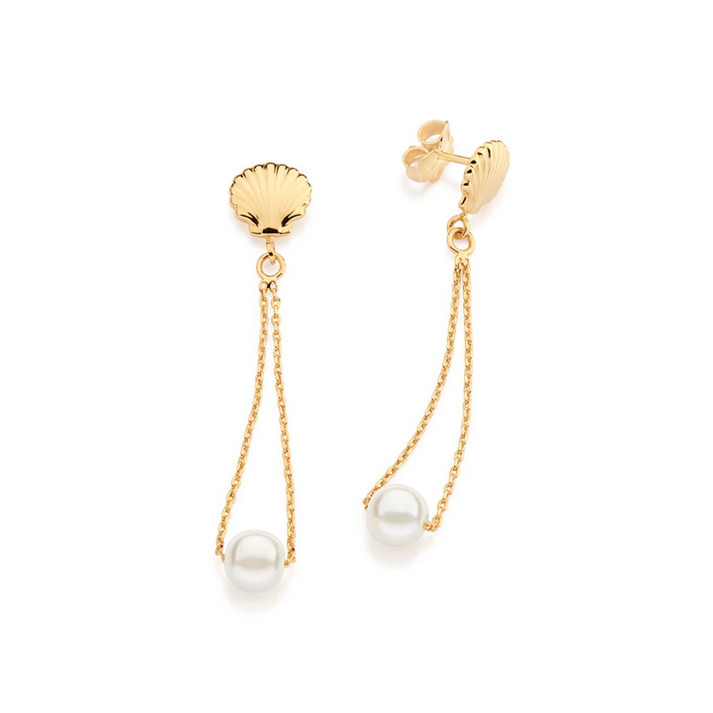 BRINCO CONCHA COM CORRENTE DE ELO CADEADO FIO 0,30MM E DUAS PÉROLAS SINTÉTICAS DE 6MM PÊNDULAS (PAR). MED 4,70CM X 0,80CM. COLEÇÃO DIVINA 2025