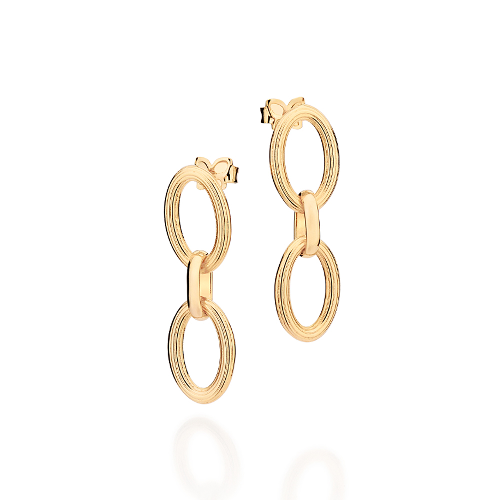 BRINCO PÊNDULO FORMADO POR 4 ELOS OVAIS COM FRISOS (PAR). MED 3,20CM X 1,00CM. COLEÇÃO DIVINA 2025