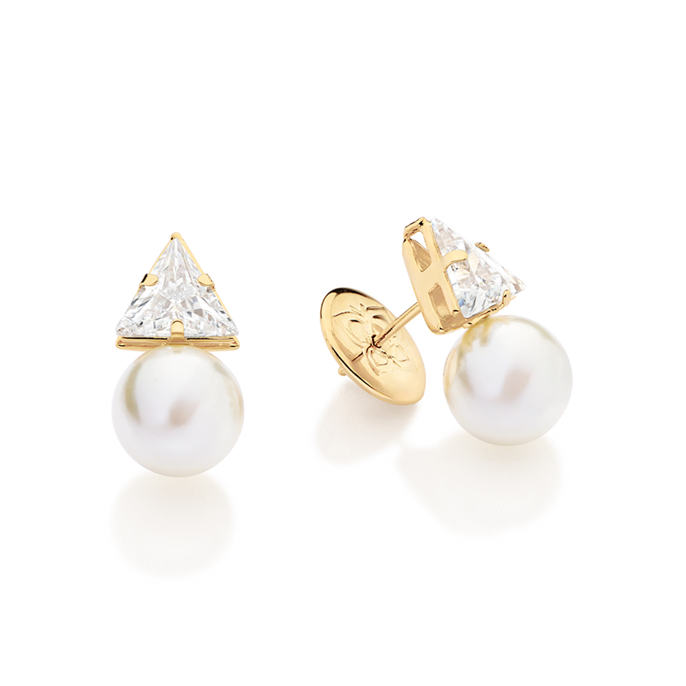 BRINCO COMPOSTO POR 2 ZIRCÔNIAS TRIANGULARES DE 9X9MM E 2 PÉROLAS SINTÉTICAS DE 10MM (PAR). MED 2,80CM X 1,00. COLEÇÃO DIVINA 2025