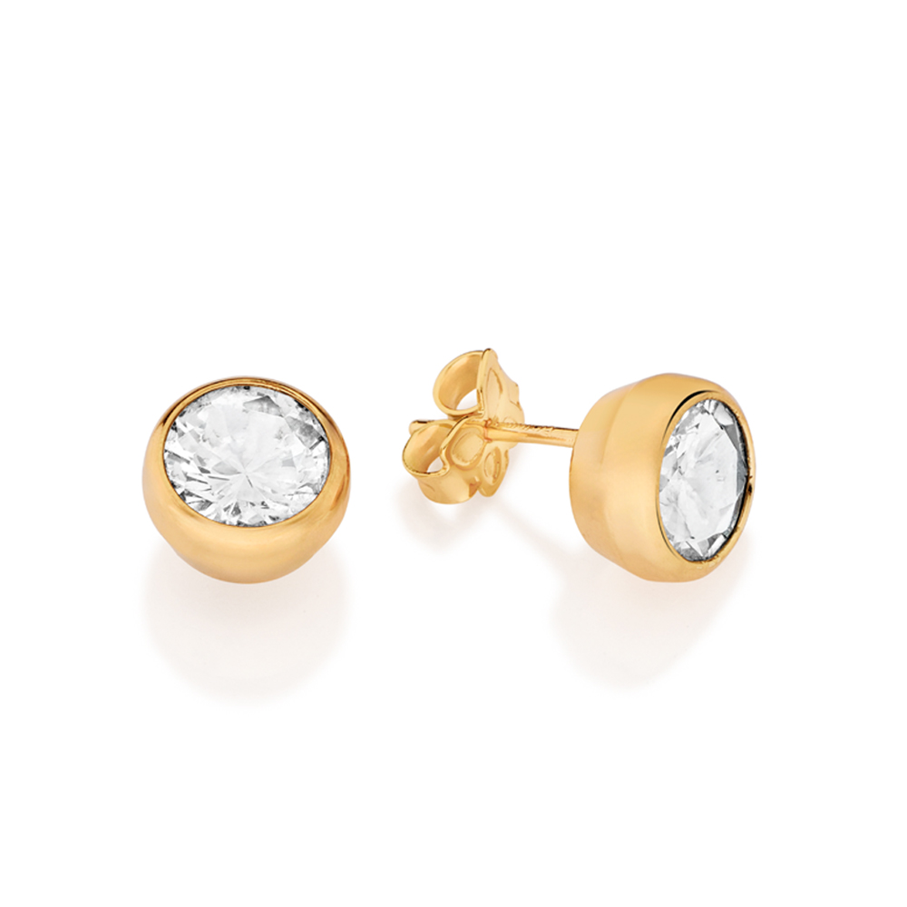 BRINCO SOLITÁRIO COM 2 ZIRCÔNIAS DE 8,00MM (PAR). MED 0,90CM. COLEÇÃO ELOS - DIA DAS MÃES 2026