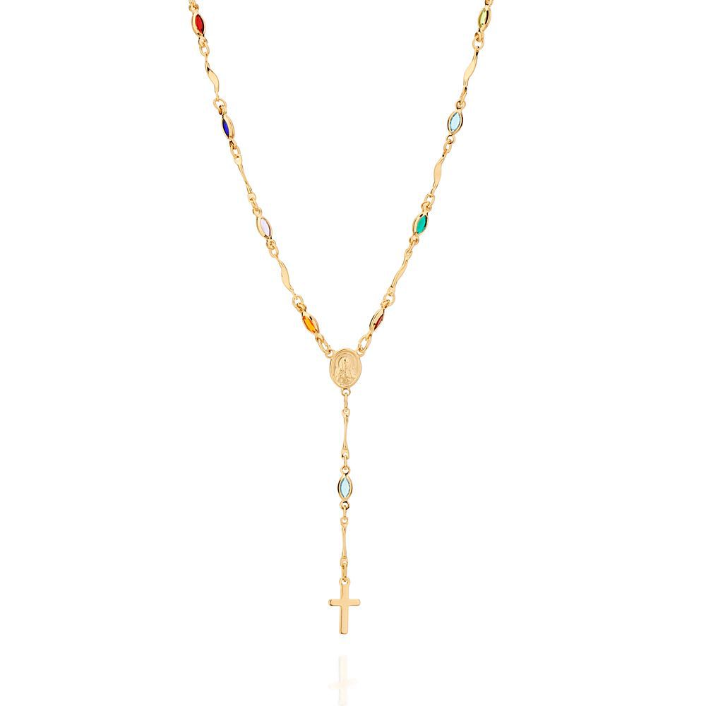 GARGANTILHA TERÇO FORMADA POR PEDRAS COLORIDAS, MEDALHA SAGRADO CORAÇÃO DE JESUS E CRUZ NA PONTA. MED 46CM. COLEÇÃO ANUAL 2018