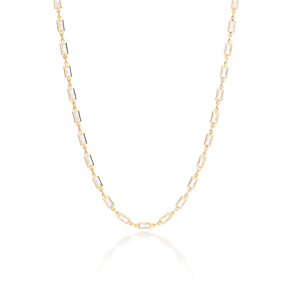 GARGANTILHA FORMADA POR CORRENTE COM 34 ZIRCÔNIAS RETANGULARES DE 6X3MM. MED 45CM. COLEÇÃO DIVINA 2025