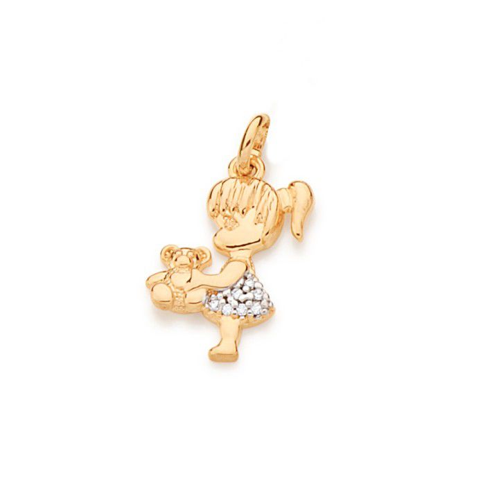 PINGENTE MENINA SEGURANDO URSO DE PELÚCIA CRAVEJADO POR 7 ZIRCÔNIAS DE 1,50MM COM APLICAÇÃO DE RHODIUM. MED 2,20CM X 1,20CM. COLEÇÃO ANUAL 2018