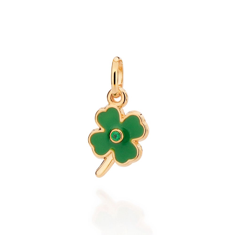 PINGENTE TREVO DE QUATRO FOLHAS COMPOSTO POR 1 ZIRCÔNIA DE 2,00MM E APLICAÇÃO DE RESINA. MED 2,1CM X 1,1CM. COLEÇÃO FESTEJAR 2023
