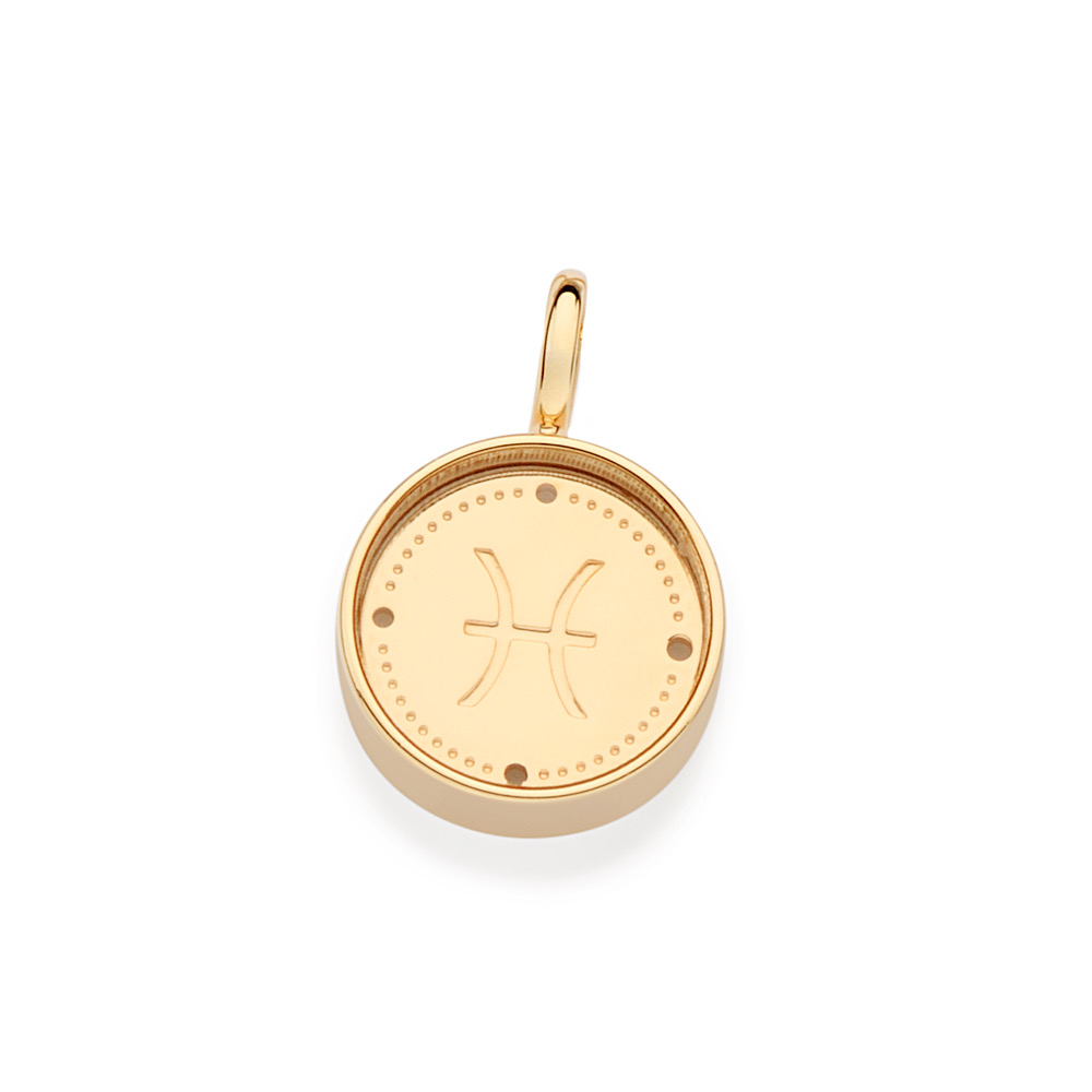 PINGENTE ESCRITO PEIXES DE UM LADO E SÍMBOLO DO SIGNO DO OUTRO LADO COMPOSTO POR ACRÍLICO. MED 2,3 X 1CM. COLEÇÃO ANUAL BAILARINA 2024