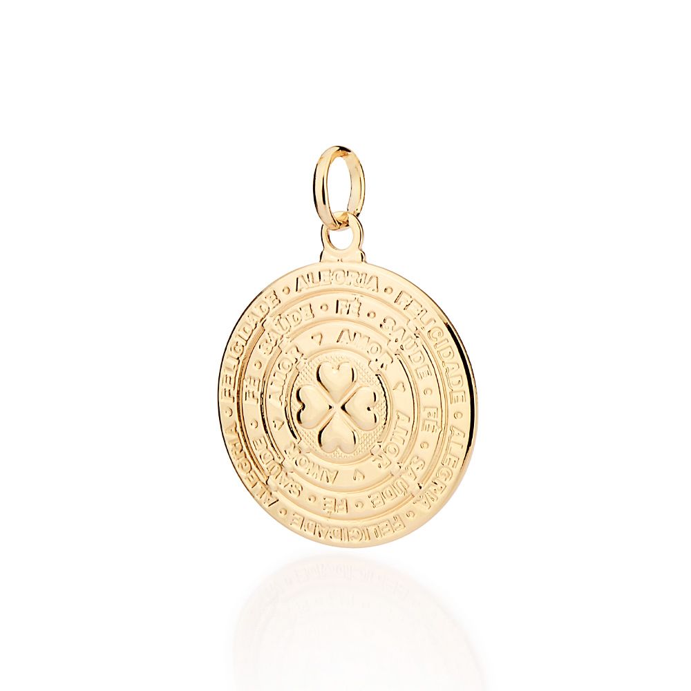 PINGENTE MEDALHA ABAULADO ESCRITO ALEGRIA, FELICIDADE, SAÚDE, FÉ E AMOR. INTERCALADOS POR CORAÇÕES COMPOSTO POR 1 TREVO DE QUATRO FOLHAS EM ALTO RELEVO AO CENTRO. MED 3,5CM X 2,5CM. COLEÇÃO MÃE NATUREZA - GIO ANTONELLI 2024