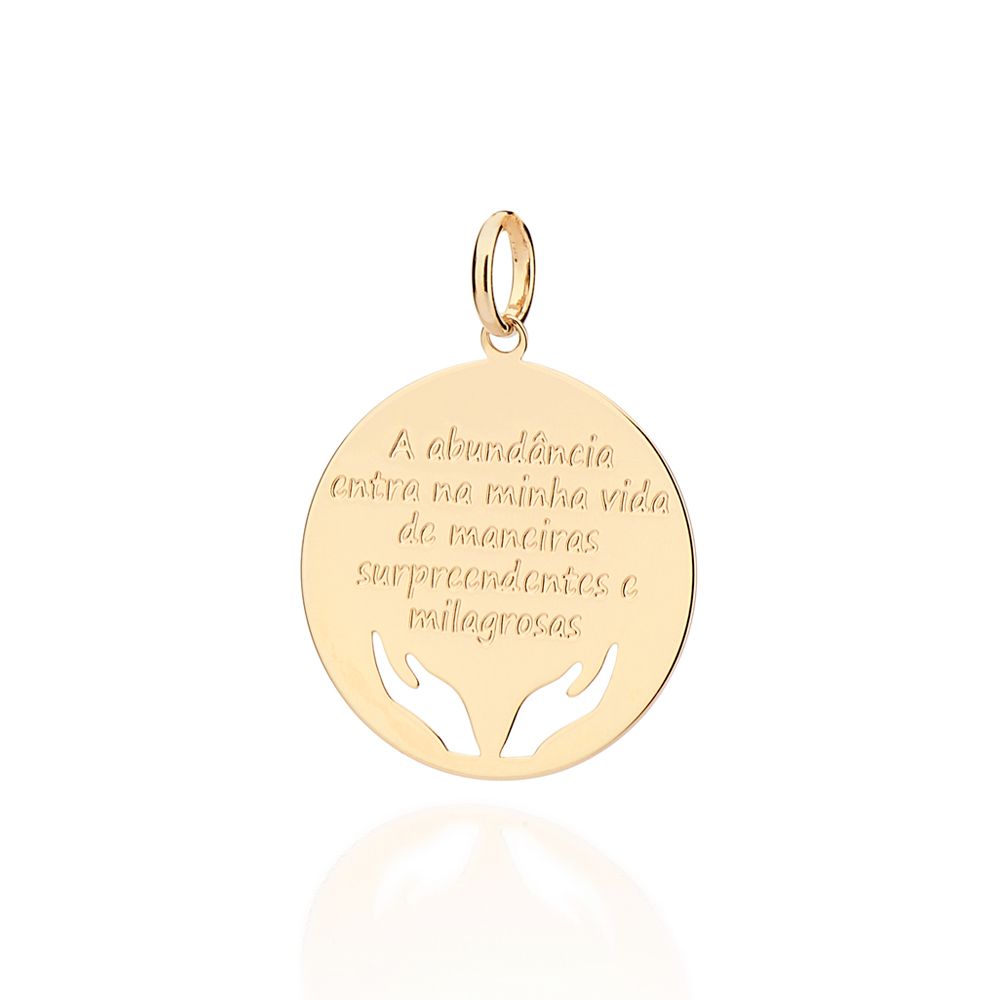 PINGENTE COMPOSTO POR FRASE: A ABUNDÂNCIA ENTRA NA MINHA VIDA DE MANEIRAS SURPREENDENTES E MILAGROSAS. COMPOSTO POR DUAS MÃOS VAZADAS. MED 3,3CM X 2,4CM. COLEÇÃO MÃE NATUREZA - GIO ANTONELLI 2024