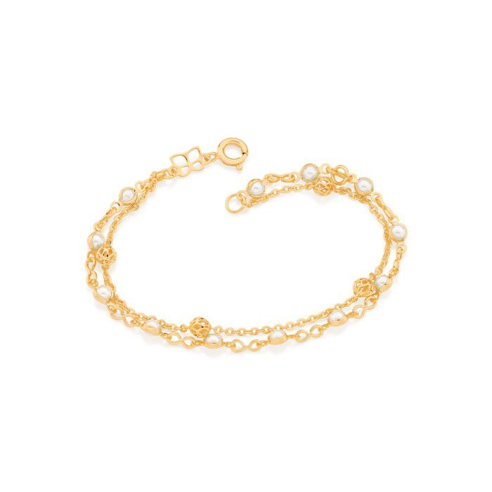 PULSEIRA INFANTIL FORMADA POR 2 FIOS DIFERENTES, SENDO 1 DE PÉROLA SINTÉTICA (TOTAL 12) E OUTRO COM GLOBOS VAZADOS. MED 16CM AJUSTÁVEL 14CM. COLEÇÃO ANUAL 2018