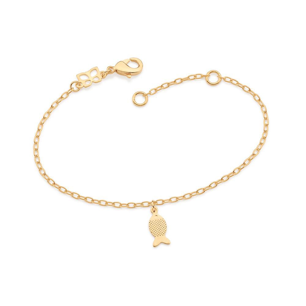 PULSEIRA FORMADA POR CORRENTE DE ELO CADEADO FIO 0,35MM, COMPOSTA POR PINGENTE FORMATO PEIXE PENDURADO. MED 16CM AJUSTÁVEL 14CM. COLEÇÃO HORA DE BRINCAR 2022
