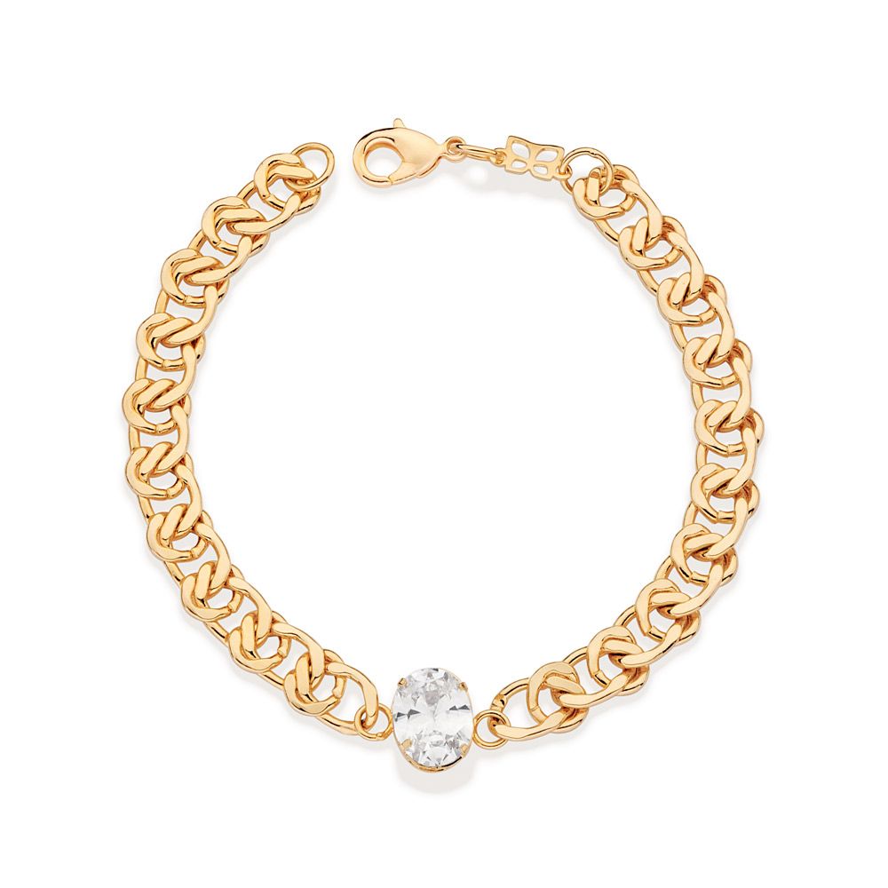 PULSEIRA FORMADA POR CORRENTE DE ELOS DUPLOS FIO 1,20MM E PINGENTE COM 1 ZIRCÔNIA BRANCA OVAL DE 8X10MM AO CENTRO. MED 19CM. COLEÇÃO ESPLÊNDIDA - 2024
