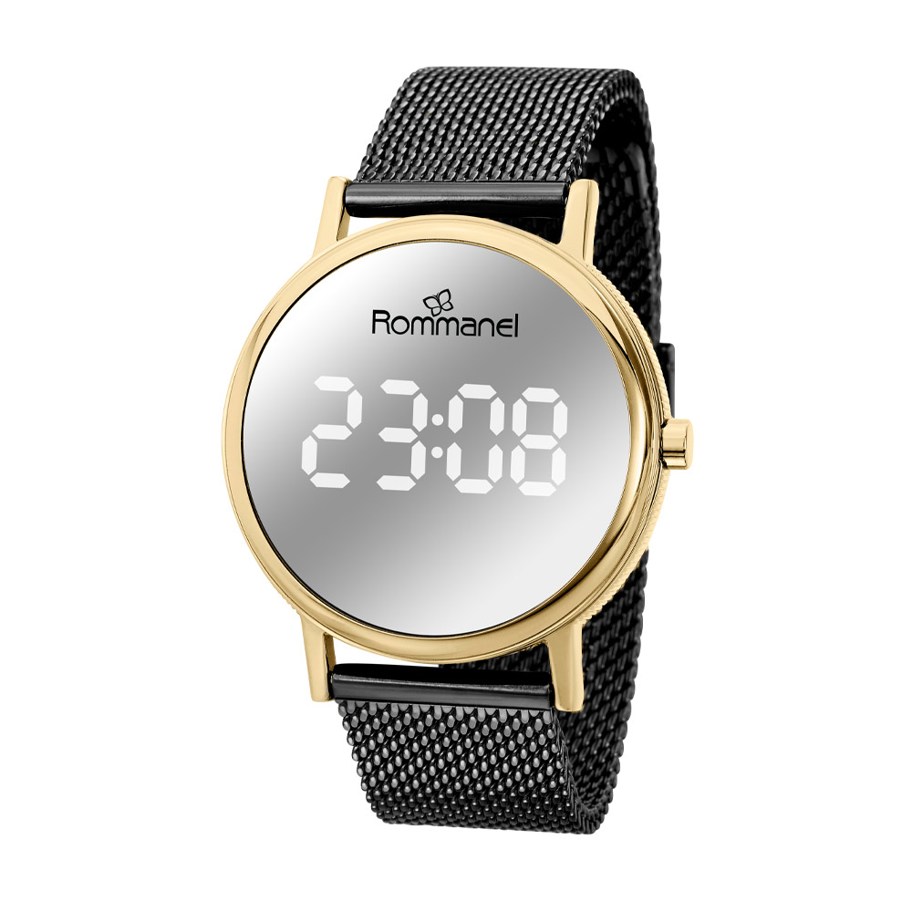 RELÓGIO DIGITAL LED DOURADO COM PRETO, CAIXA REDONDA DE METAL COM MOSTRADOR ESPELHADO E NÚMEROS BRANCOS, VIDRO MINERAL E PULSEIRA DE AÇO MESH PRETO COM FECHO SLIDE, RESISTENTE A ÁGUA EM ATÉ 50M. COLEÇÃO WATCHES 2025