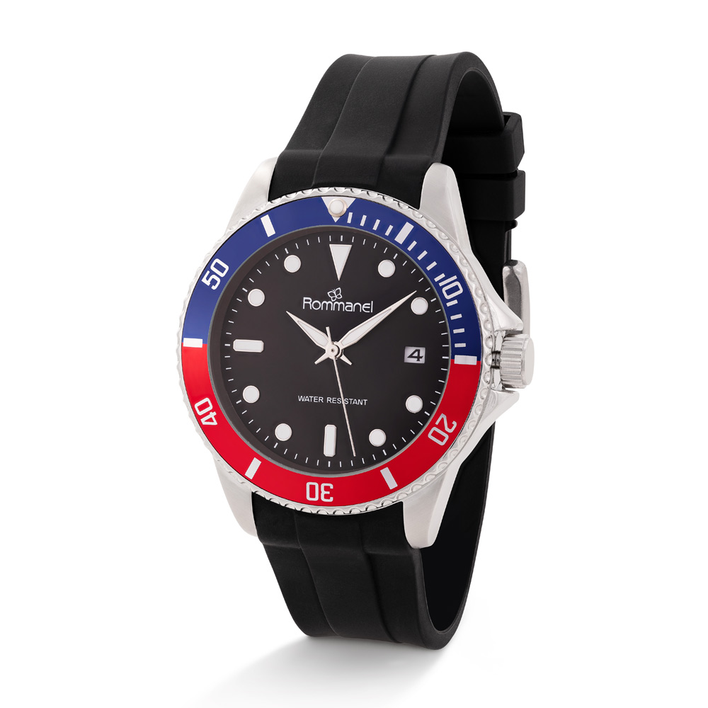 RELÓGIO ANALÓGICO SOCIAL PRETO, CAIXA REDONDA DE METAL VERMELHO E AZUL, MOSTRADOR PRETO COM CALENDÁRIO, NÚMEROS E PONTEIROS BRANCO COM CINZA, VIDRO MINERAL, PULSEIRA DE SILICONE PRETO, FECHO FIVELA, RESISTENTE A ÁGUA EM ATÉ 50M. COLEÇÃO WATCHES 2025