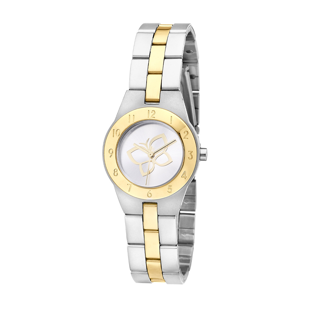 RELÓGIO ANALÓGICO SOCIAL MISTO PRATA COM DOURADO, CAIXA REDONDA DE METAL COM NÚMEROS, MOSTRADOR CINZA METÁLICO COM BORBOLETA AO CENTRO, PONTEIROS DOURADOS, VIDRO MINERAL, PULSEIRA DE AÇO MISTA. COLEÇÃO WATCHES 2025