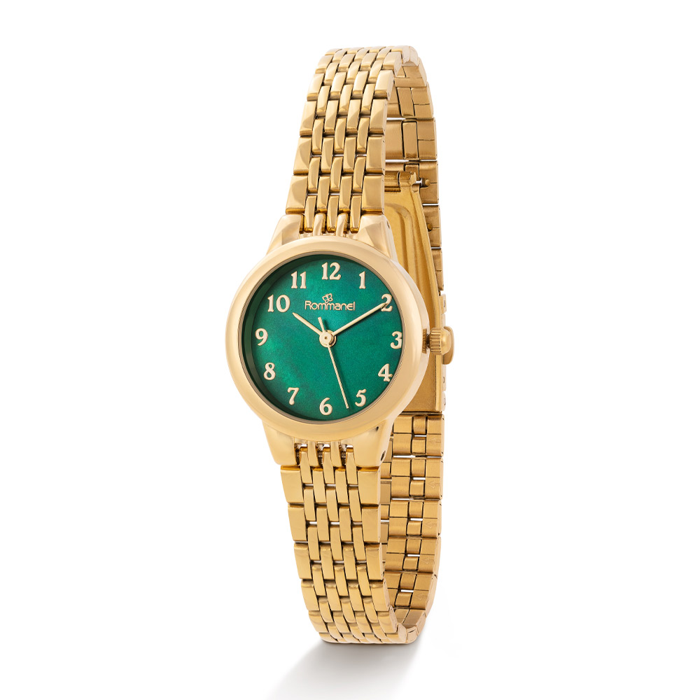 RELÓGIO ANALÓGICO SOCIAL DOURADO, CAIXA REDONDA DE METAL, MOSTRADOR INSPIRADO NA MADREPÉROLA VERDE, NÚMEROS E PONTEIROS DOURADOS, VIDRO MINERAL, PULSEIRA DE AÇO, FECHO TRAVA DE PRESSÃO, RESISTENTE A ÁGUA EM ATÉ 50M. COLEÇÃO WATCHES 2025