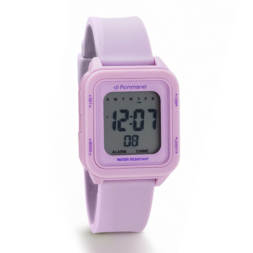 RELÓGIO DIGITAL LILÁS, CAIXA RETANGULAR DE PLÁSTICO, MOSTRADOR NEUTRO COM DISPLAY POSITIVO, NÚMEROS PRETO, VIDRO ACRÍLICO COM CONTORNO PINTADO LILÁS, PULSEIRA DE SILICONE, FECHO FIVELA, RESISTENTE A ÁGUA EM ATÉ 50M. COLEÇÃO SUMMER WATCHES 2025