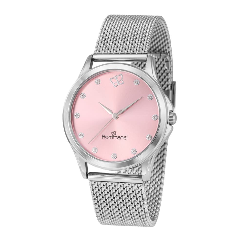 RELÓGIO ANALÓGICO SOCIAL PRATA, CAIXA REDONDA DE METAL, MOSTRADOR ROSA COM 11 CRISTAIS E 1 BORBOLETA, PONTEIROS CINZA, VIDRO MINERAL, PULSEIRA DE AÇO, FECHO SLIDE COM TRAVA DE PRESSÃO, RESISTENTE A ÁGUA EM ATÉ 50M. NÃO É A PROVA D'ÁGUA, E SIM, RESISTENTE A ÁGUA EM ATÉ 50M. COLEÇÃO WATCHES 2026