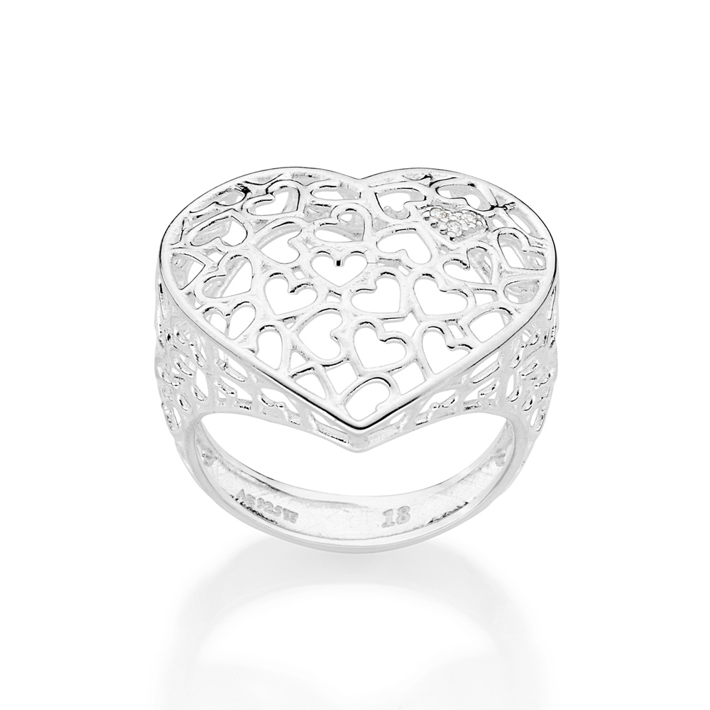 MAXI ANEL CORAÇÃO COM DIVERSOS CORAÇÕES VAZADOS E 1 CRAVEJADO POR 3 ZIRCÔNIAS DE 1,0MM.