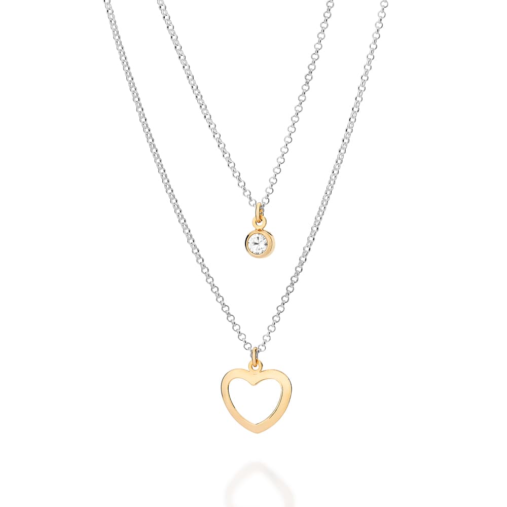 GARGANTILHA CORRENTE DE ELO PORTUGUÊS FIO 0,30MM DUPLA COM PONTO DE LUZ E 1 ZIRCÔNIA DE 4MM E PINGENTE CORAÇÃO VAZADO BANHADOS A OURO 18K. MED 42CM. COLEÇÃO ELOS - DIA DAS MÃES 2026