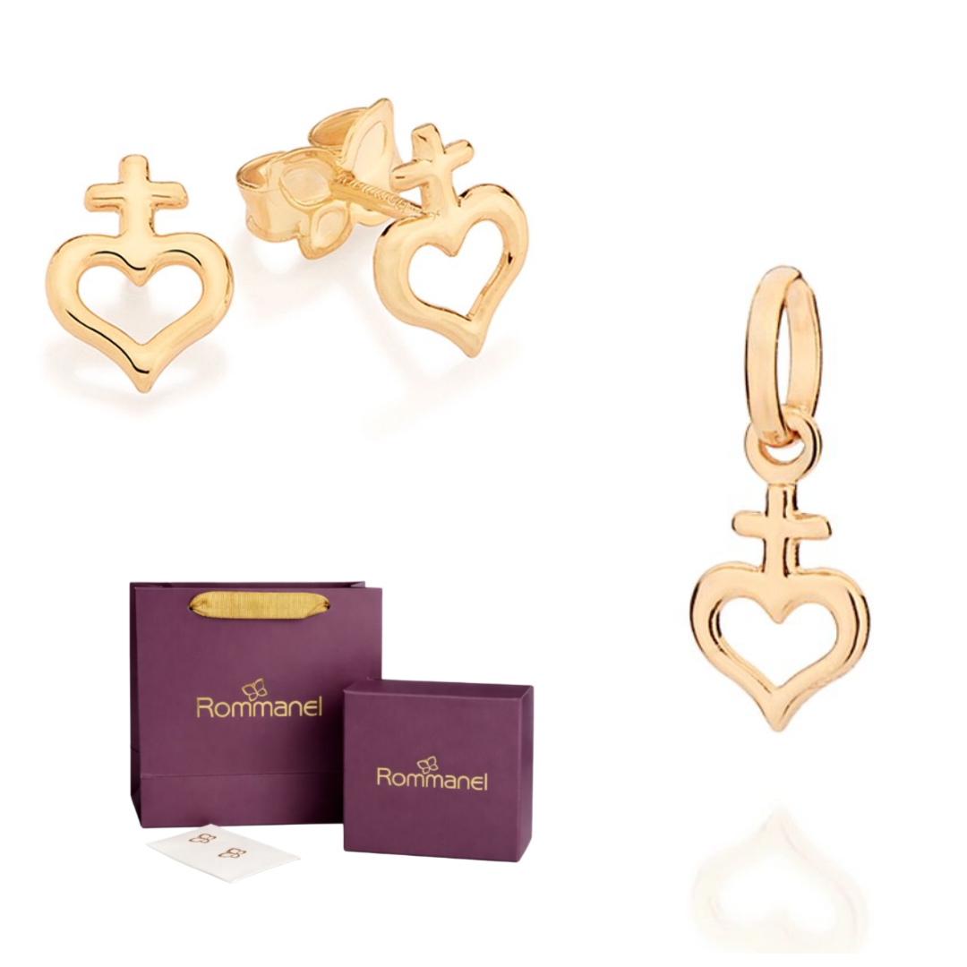 PINGENTE CORAÇÃO VAZADO COM CRUZ. MED 1,60CM X 0,60CM 542967 + 1 PAR DE BRINCO CORAÇÃO VAZADO COM CRUZ. MED 0,90CM X 0,70CM 527544.