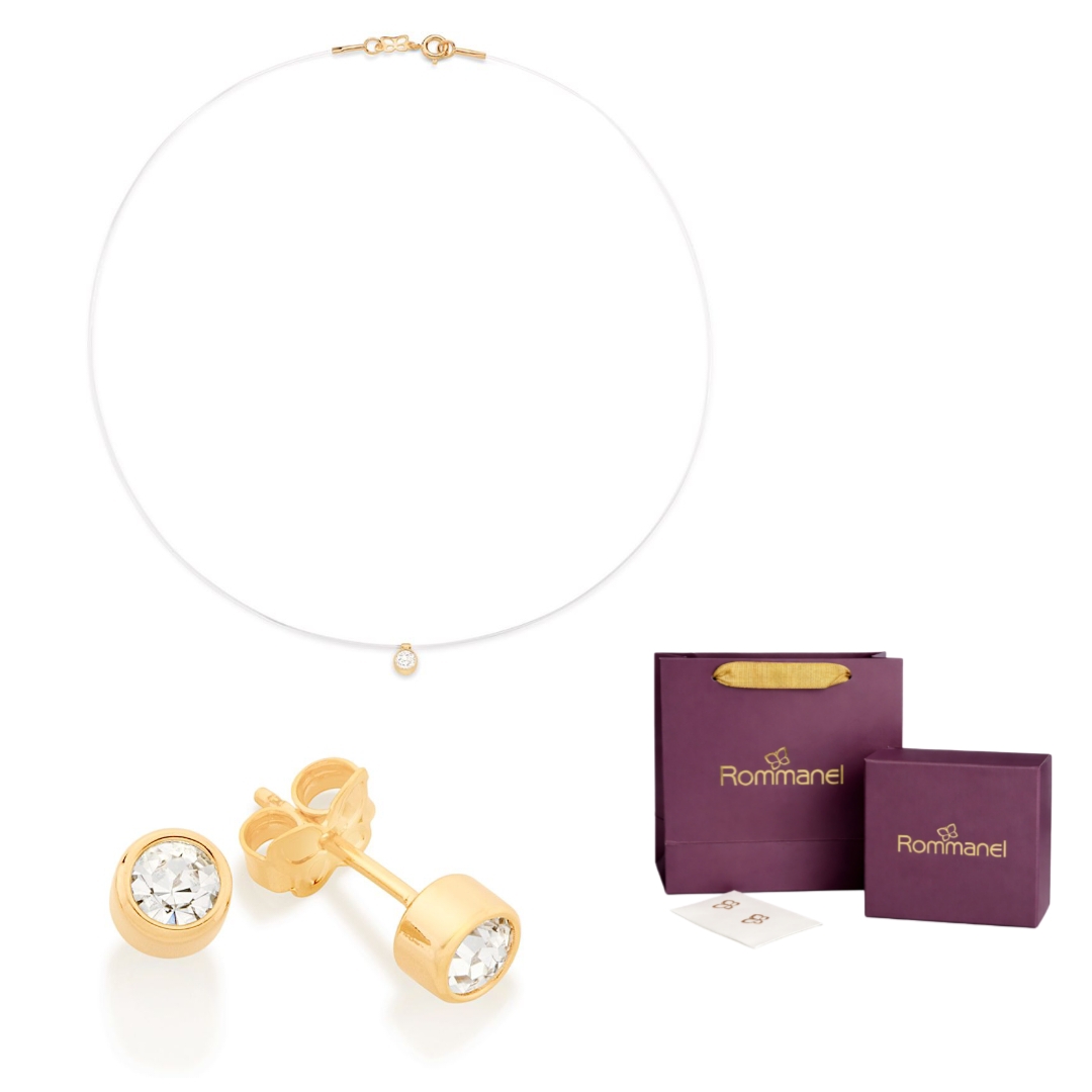 GARGANTILHA FIO DE NYLON COM ZIRCÔNIA DE 4MM, PONTO DE LUZ. MED 40/42CM 531837 + BRINCO SOLITÁRIO COMPOSTO POR 2 CRISTAIS DE 4MM (PAR). MED 0,4MM DIÂMETRO 520185.